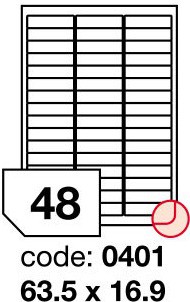 ART. RAYFILM 63,5 x 16,9mm bílé etikety jsou vyrobeny ze samolepicího bílého papíru, který má svrchní bílý bezdřevý papír gramáže 70g/m2 spojen permanentním akrylátovým lepidlem se spodním bílým podkladovým papírem o gramáži 55 g/m2. Označení: R0100.0401A Rozměr: 63,5 x 16,9