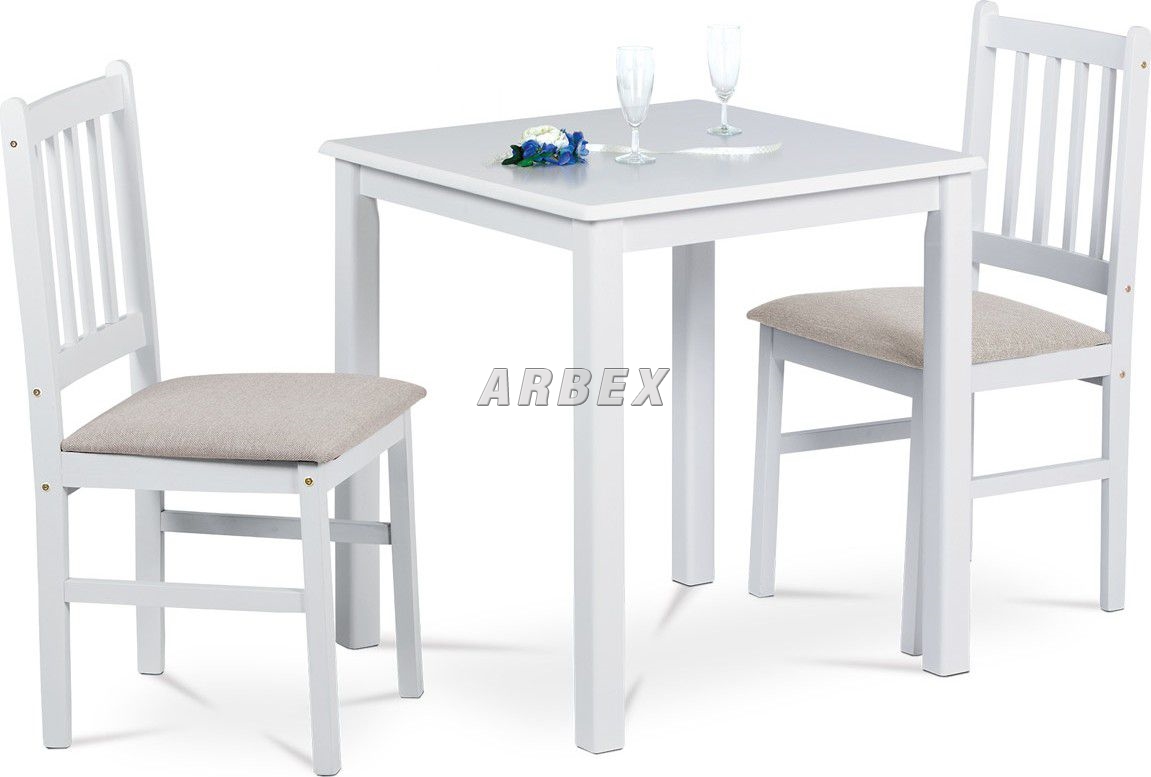 Jídelní set ve skandinávském stylu s v minimalistickém provedení. Je složen z čtvercového jídelního stolu a dvou jídelních židlí. Stůl je o rozměru 69 x 69 x 75 cm. Deska a nohy jsou vyrobena masivního kaučukovníkového dřeva. Celý stůl je v bílém matném odstínu. Použitý materiál zajišťuje dostatečnou pevnost i stabilitu celého stolu. Nohy jsou opatřeny plastovými kluzáky, zamezujícími riziko poškození podlahy. židle jsou vyrobeny také z masivního kaučukovníku v povrchové úpravě bílý mat. Sedák je polstrovaný kvalitní PU pěnou a potažený středně hrubou látkou v šedobéžovém trendy odstínu. Nohy jsou opatřeny plastovými kluzáky k zamezení možnosti poškození podlahy. Nosnost židle je až 110 kg. ROZMĚR židle 43 x 47 x 89 x 47 cm, nosnost 100 kg