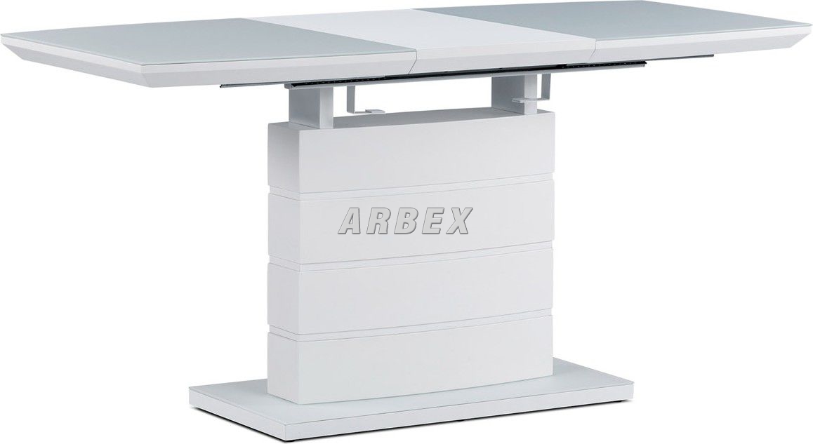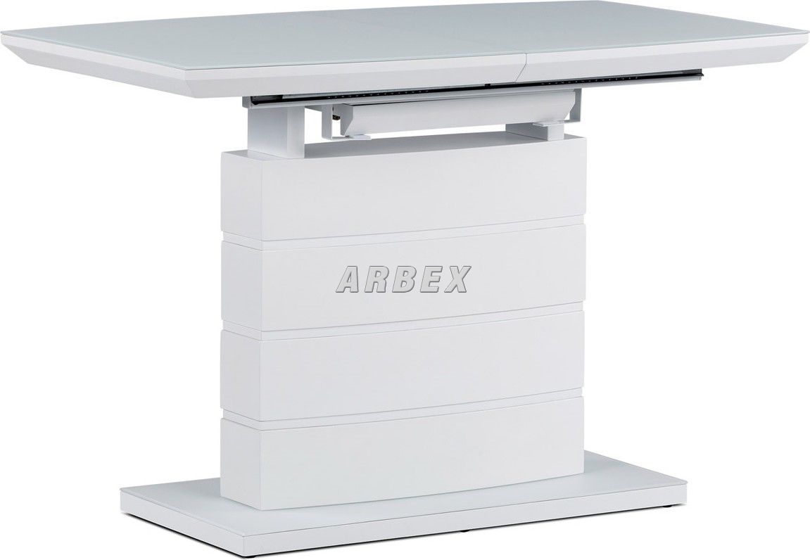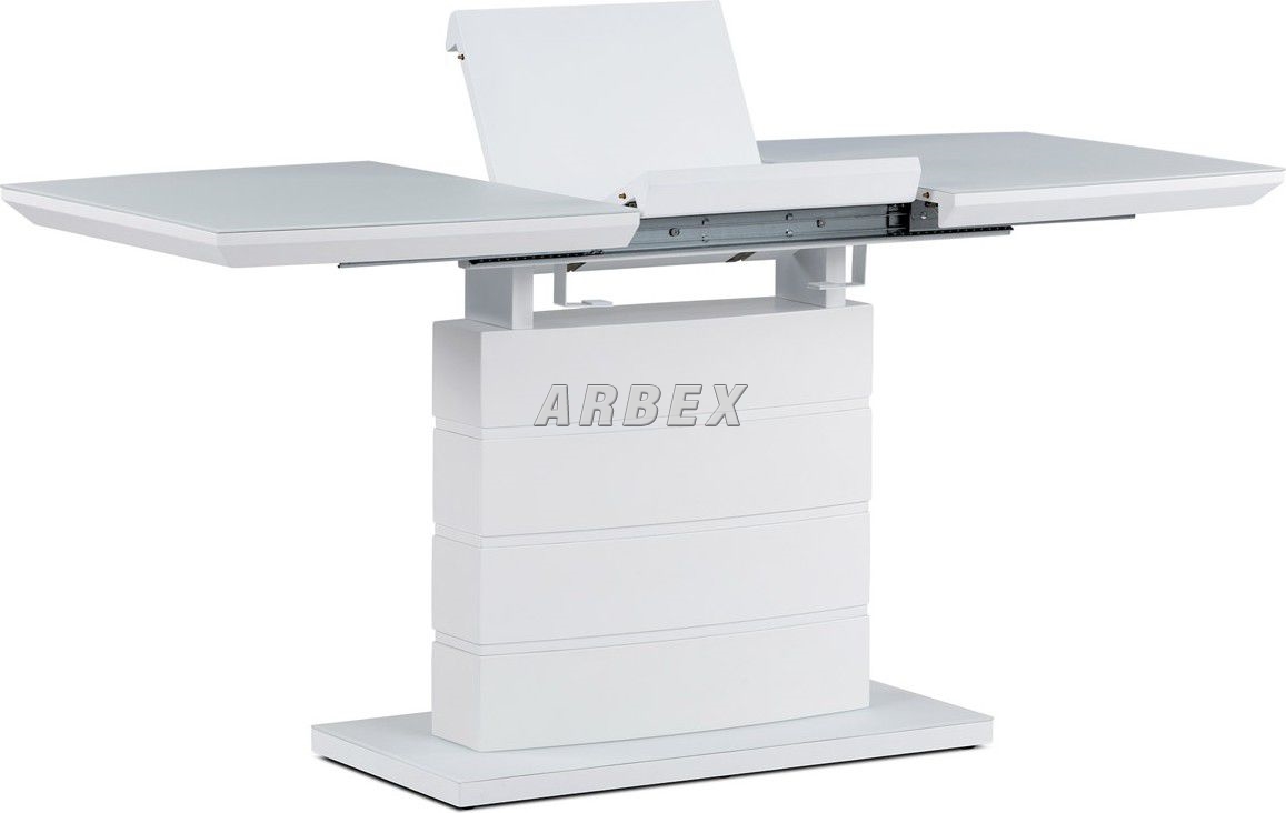 Designový jídelní rozkládací stůl o rozměru 110 + 40 x 70 cm. Vrchní stolová deska je tvrzeného skla tl. 4 mm v bílé barvě. Podkladová deska, centrální noha a díl rozkladu je z MDF v nadčasové bílé matné barvě. Podesta je z také z MDF a krytá bílým sklem. Ze spodní části opatřená plastovými kluzáky, eleminujícími poškození povrchů tvrdých podlah. Mechanické součásti jsou kovové. Stůl jistě zaujme svým nadčasovým designem i skvělým zpracováním detailu a v neposlední řadě i barvou a stane se elegantním prvkem v moderních i klasicky laděných jídelnách, kuchyních a obývacích prostorách. Výška stolu je 76 cm. Ke stolu je možné umístit až 6 židlí.