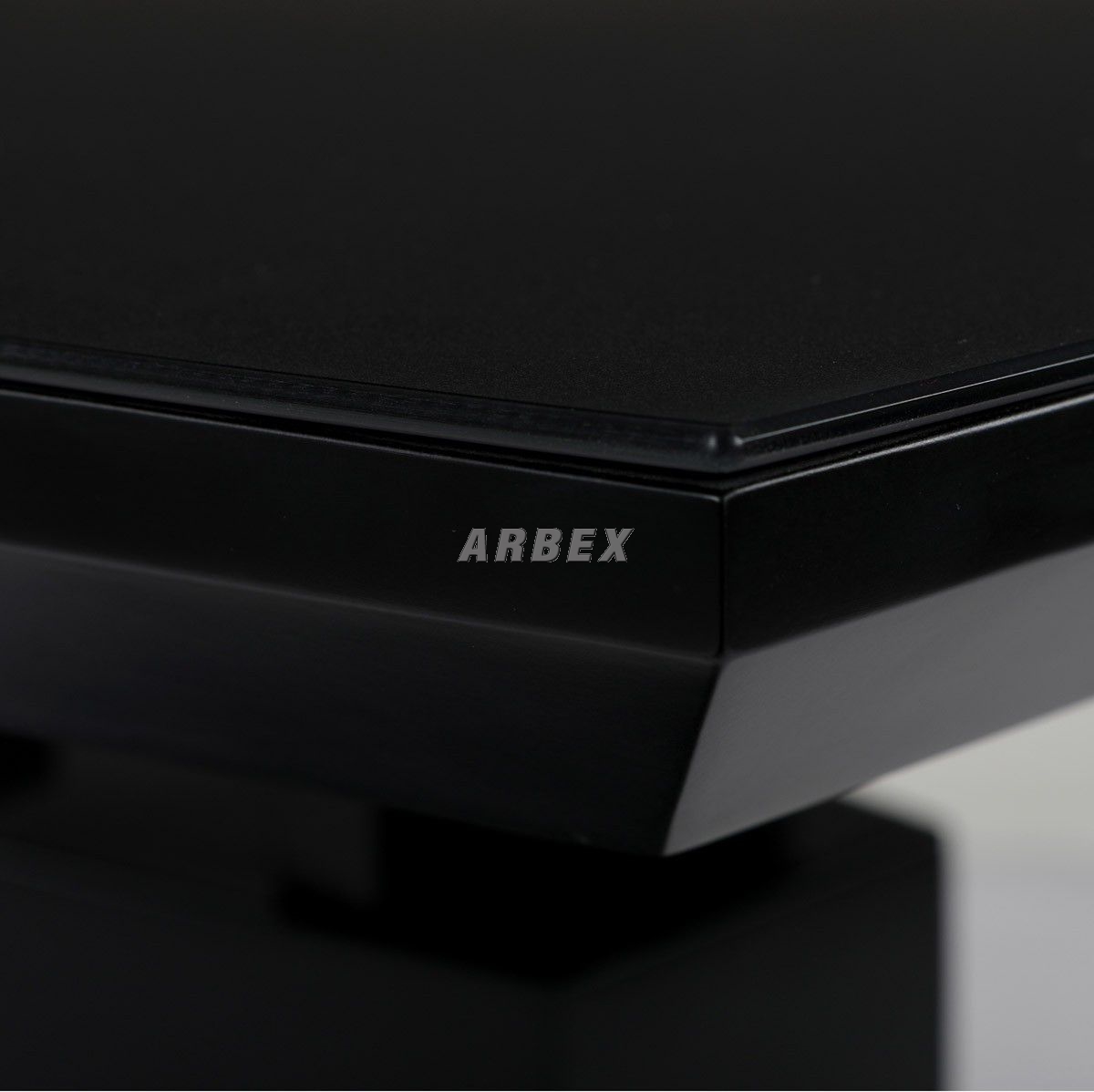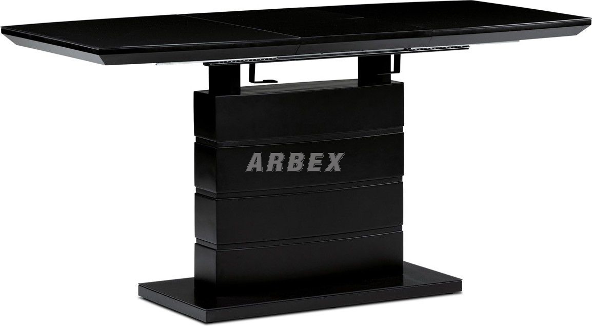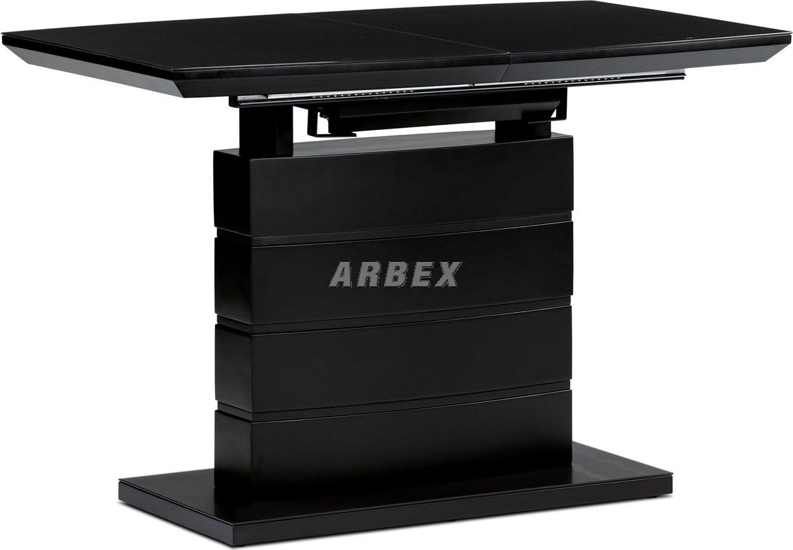 Designový jídelní rozkládací stůl o rozměru 110 + 40 x 70 cm. Vrchní stolová deska je tvrzeného skla tl. 4 mm v černé barvě. Podkladová deska, centrální noha a díl rozkladu je z MDF ve slušivé černé matné barvě. Podesta je z také z MDF a krytá černým sklem. Ze spodní části opatřená plastovými kluzáky, eleminujícími poškození povrchů tvrdých podlah. Mechanické součásti jsou kovové. Stůl jistě zaujme svým nadčasovým designem i skvělým zpracováním detailu a v neposlední řadě i barvou a stane se elegantním prvkem v moderních i klasicky laděných jídelnách, kuchyních a obývacích prostorách. Výška stolu je 76 cm. Ke stolu je možné umístit až 6 židlí.