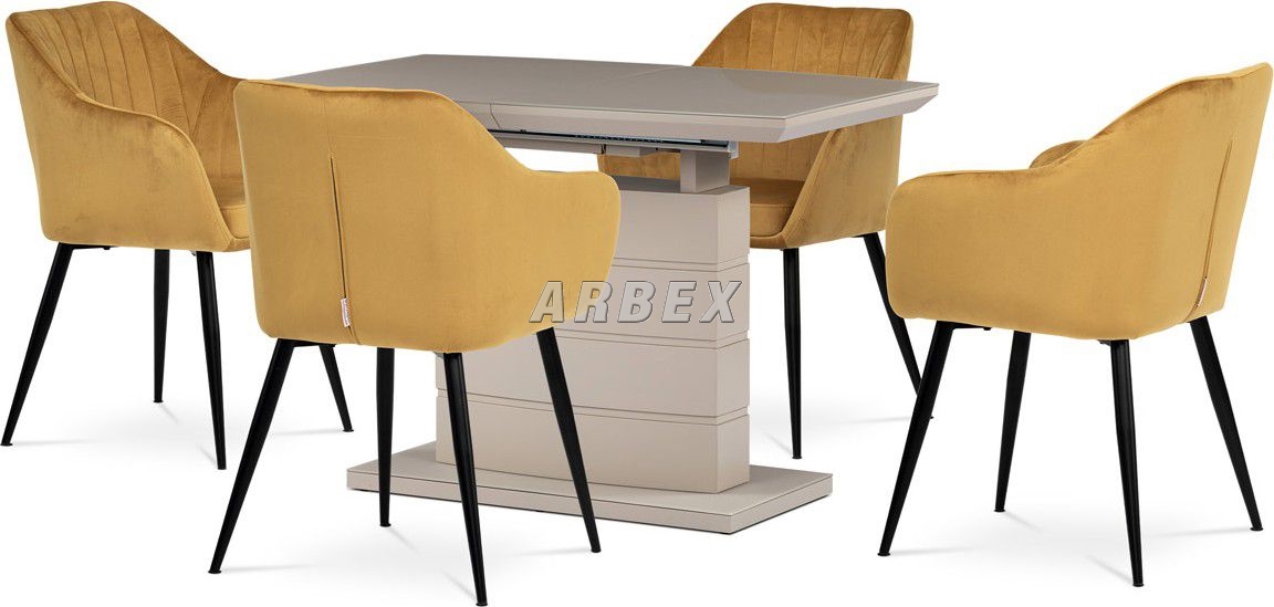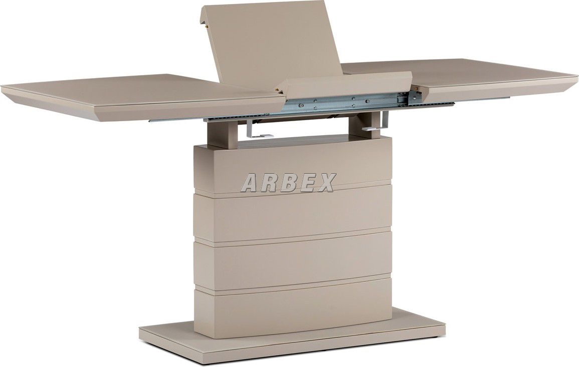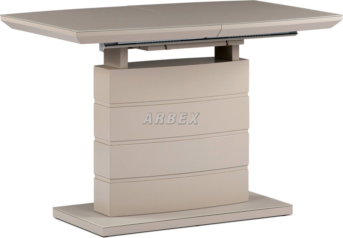 Designový jídelní rozkládací stůl o rozměru 110 + 40 x 70 cm. Vrchní stolová deska je tvrzeného skla tl. 4 mm v cappuccino barvě. Podkladová deska, centrální noha a díl rozkladu je z MDF v trendy cappuccino matné barvě. Podesta je z také z MDF a krytá sklem v cappuccino odstínu. Ze spodní části opatřená plastovými kluzáky, eleminujícími poškození povrchů tvrdých podlah. Mechanické součásti jsou kovové. Stůl jistě zaujme svým nadčasovým designem i skvělým zpracováním detailu a v neposlední řadě i barvou a stane se elegantním prvkem v moderních i klasicky laděných jídelnách, kuchyních a obývacích prostorách. Výška stolu je 76 cm. Ke stolu je možné umístit až 6 židlí.
