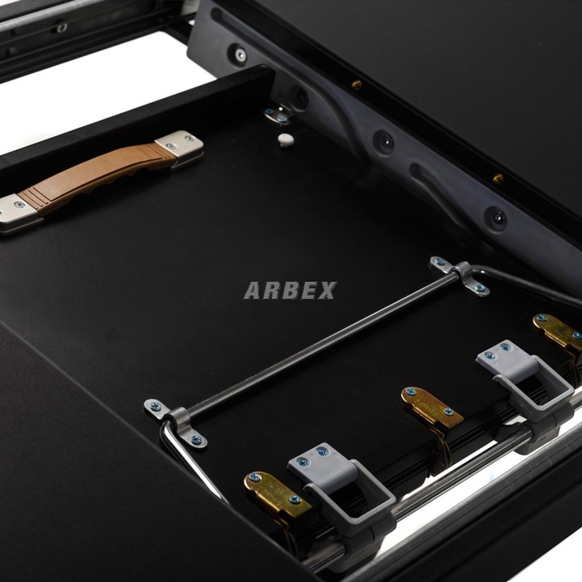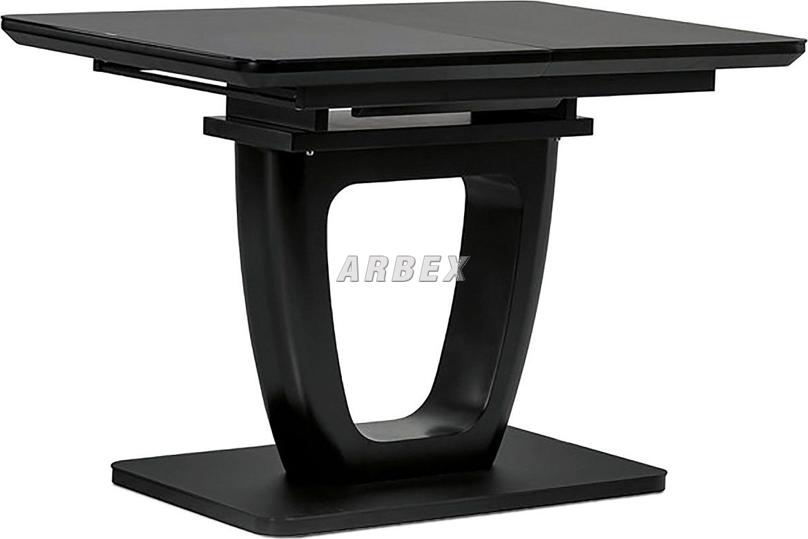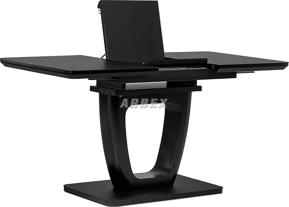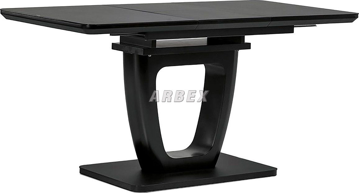 Designový jídelní rozkládací stůl o rozměru 110 + 40 x 75 cm. Vrchní stolová deska je tvrzeného skla tl. 4 mm v černé barvě. Díl rozkladu je také krytý černým sklem jako celá stolová deska, což nepatří ke standardům a řadí stůl do vyšší kategorie. Podkladová deska, centrální noha je z MDF ve slušivé černé matné barvě. Podesta je z také z MDF a krytá černým sklem. Ze spodní části opatřená plastovými kluzáky, eleminujícími poškození povrchů tvrdých podlah. Mechanické součásti jsou kovové. Stůl jistě zaujme svým nadčasovým designem i skvěloým zpracováním detailu a v neposlední řadě i barvou a stane se elegantním prvkem v moderních i klasicky laděných jídelnách, kuchyních a obývacích prostorách. Výška stolu je 76 cm. Ke stolu je možné umístit až 6 židlí.