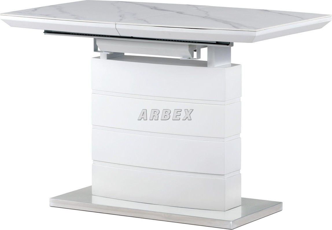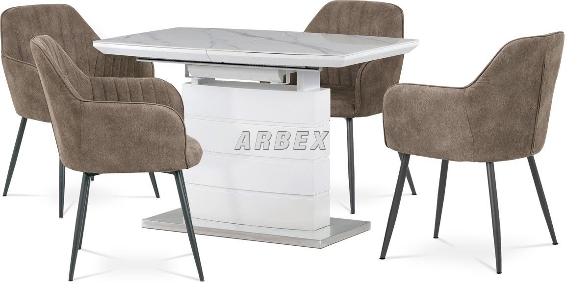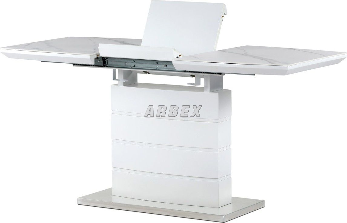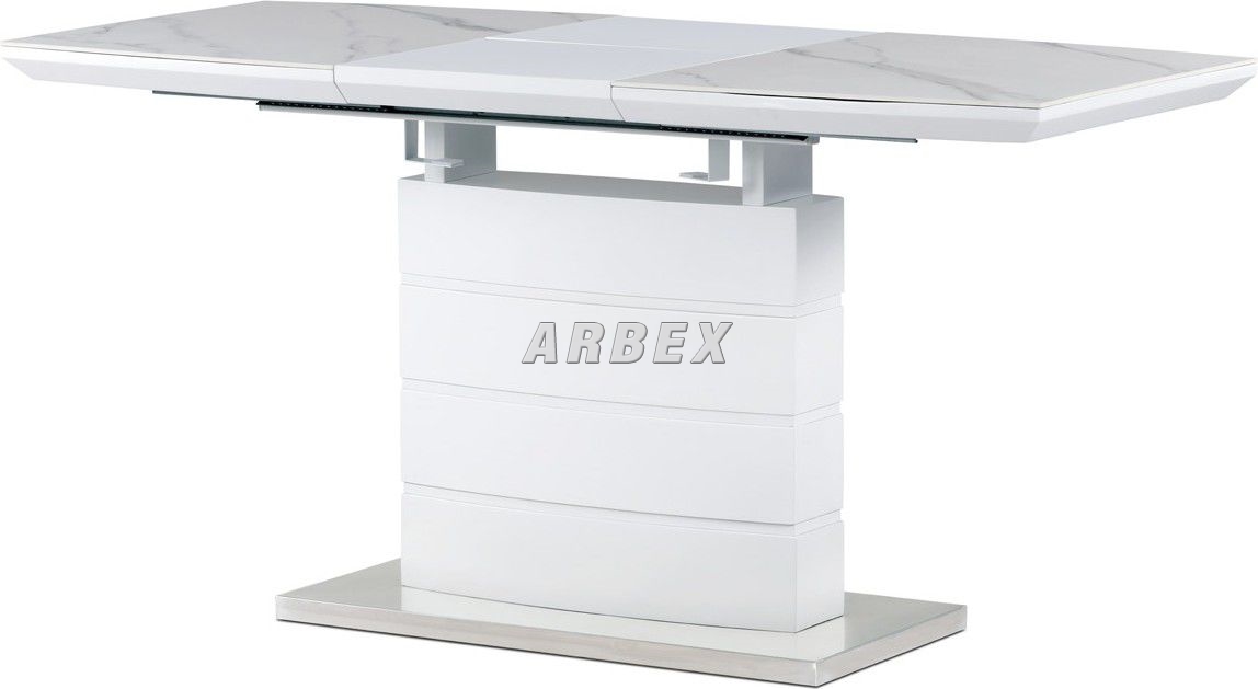 Jídelní rozkládací stůl o rozměru 120 + 40 x 70 cm. Vrchní stolová deska je z matné tvrzené keramiky tl. 6 mm v dekoru „Italský sněhobílý mramor“. Podkladová deska, centrální noha vkladová deska rozkladu je z MDF v bílé matné barvě. Podesta je z broušeného nerezu, ze spodní části opatřená plastovými kluzáky, eleminujícími poškození povrchů tvrdých podlah. Mechanické součásti jsou kovové. Stůl jistě zaujme svým designem i skvělou kresbou dekoru mramoru v harmonické kombinaci s barvou konstrukce a bude i elegantním prvkem v moderních a klasicky laděných jídelnách, kuchyních a obývacích prostorách. Výška stolu je 76 cm. Ke stolu je možné umístit až 8 židlí. Bílý mramor (Carrarský mramor) je jedním z nejznámějších mramorů na světě, pochází z italského města Carrara v regionu Toskánska, kde se těží už od konce římské republiky. Jedná se o čistě bílý mramor s jemným šedým žilkováním. Použití je velmi široké, od sochařství (Michelangelo, Bernini, Donatello) až po stavebnictví současné i historické.
