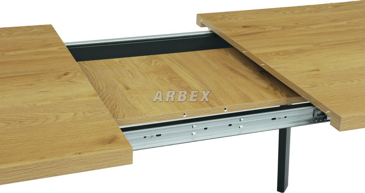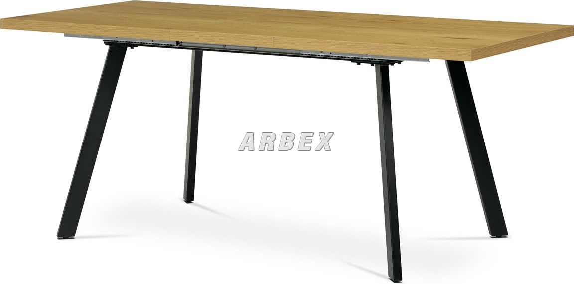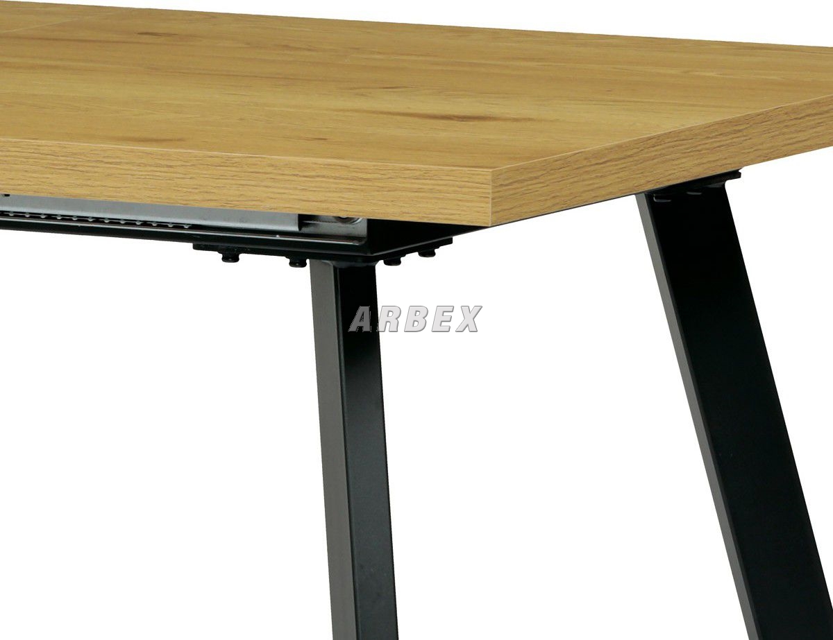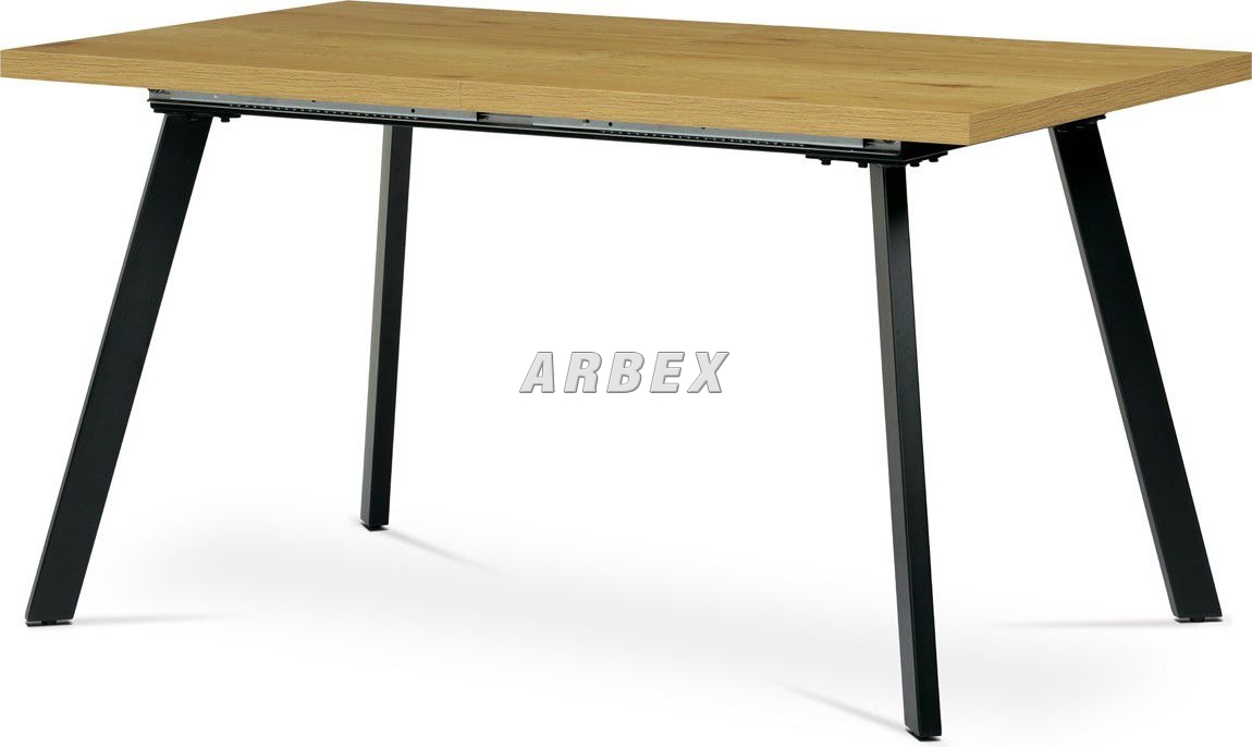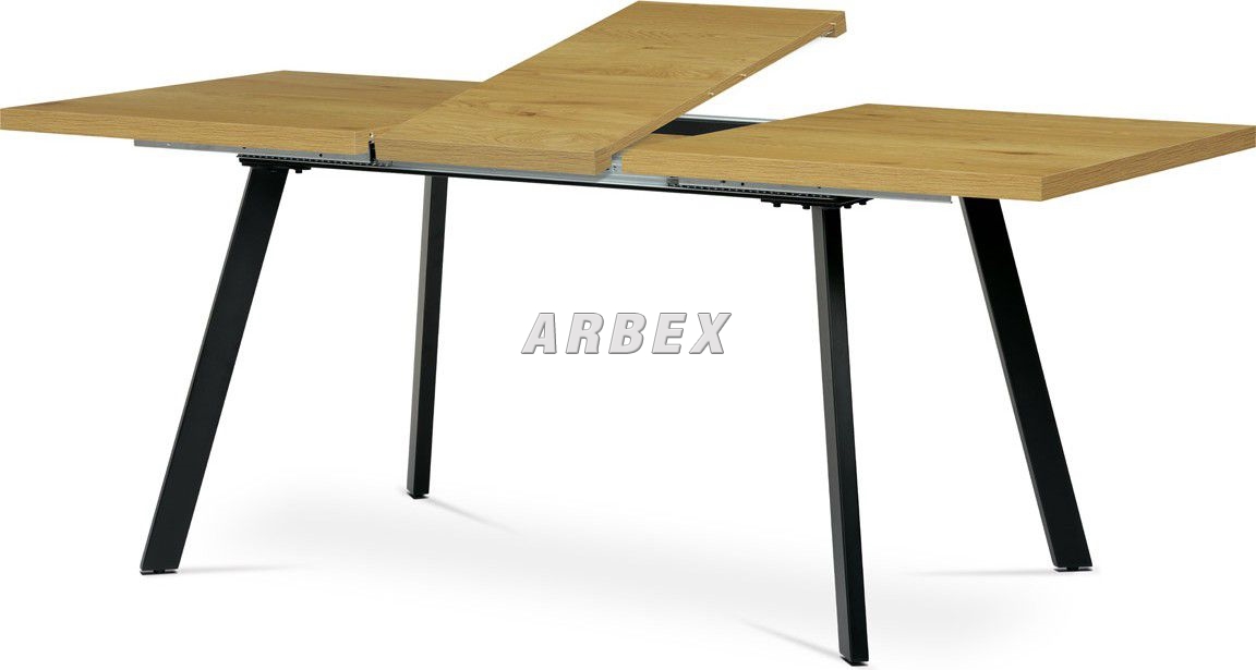 Rozkládací jídelní stůl o rozměru 140 + 40 x 85 cm v minimalistickém designu s netradičně posazenými nohami, tvořící prostorové písmeno A. Toto provedení má krom estetické hodnoty také hodnotu praktickou – při plném obsazení stolu podnož nepřekáží a neomezuje stolovníky. Kontrast světlé desky v barvě dubu a temně černá podnož zaujme a podtrhne žádaný styl loftu. Dalším bonusem tohoto stolu je jeho variabilní šířka od 140 do 180 cm. Prodloužení provedeme jednoduchým vložením středového dílu, který je umístěn pod půlenou deskou stolu. Stolní deska je z MDF desky o tloušťce 3,6 cm, potažené kvalitním melaminem v 3D dekoru divoký dub. Melaminový povrch u stolní desky zaručuje velkou odolnost vůči poškrábání a znečištění. Je odolný vůči teplu, chladu a v jisté míře i vodě. Nebledne, zachovává si barvy a má dlouho životnost. Kovové nohy obdélníkového průřezu jsou opatřeny kvalitním práškovým nástřikem v černé matném odstínu. Ve spodní části jsou opatřeny plastovými rektifikačními kluzáky, zabraňující poškození podlahové krytiny a garantující dokonalé vyvážení celého stolu. Maximální nosnost rozkládacího jídelního stolu je do 60 kg. Základní rozměry – základní šířka je 140 cm, kterou můžeme prodloužit až na 180 cm, celková hloubka 85 cm, výška 75 cm. Montáž patří mezi ty jednodušší, zvládne ji středně zručný majitel stolu, nejlépe s pomocnicí. Ke stolu je možné umístit až 6 – 8 židlí. Výborně se hodí nejen do industriálních, ale i moderních a klasicky laděných jídelen, kuchyní a obývacích prostor.