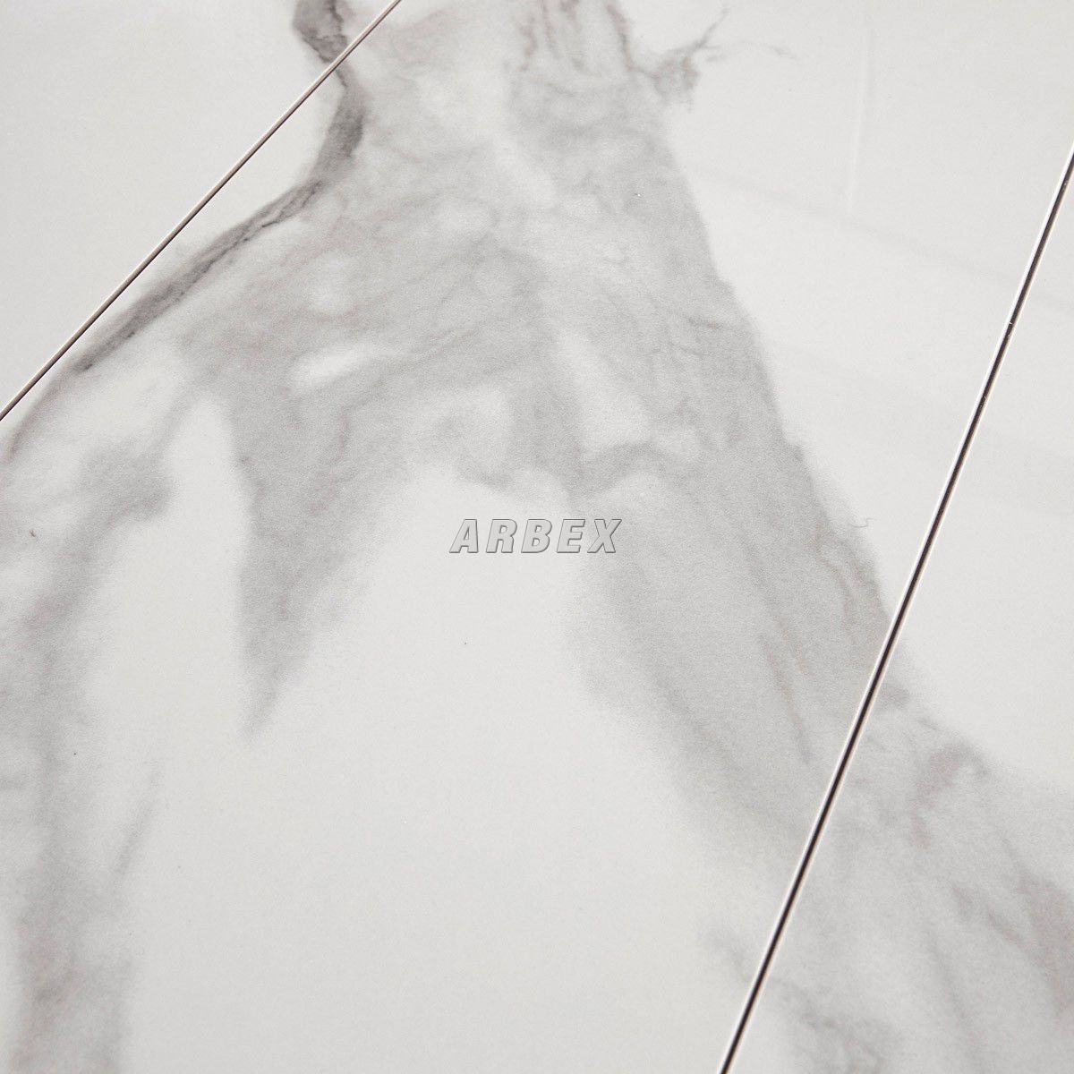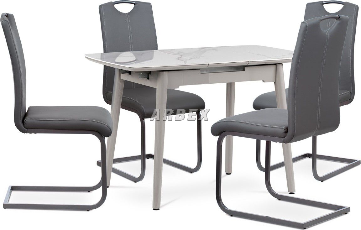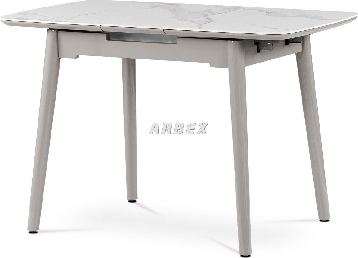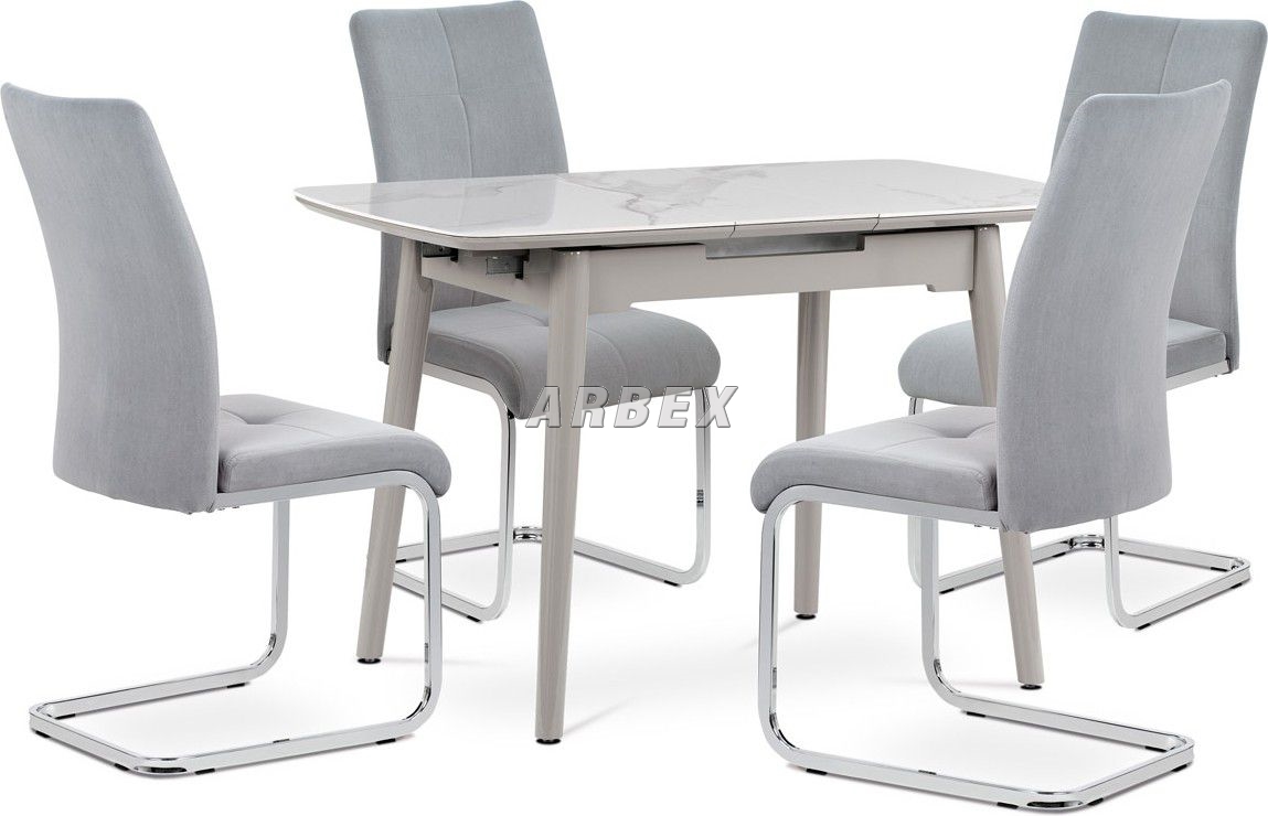 Jídelní rozkládací stůl o rozměru 94 + 25 x 78 cm z masivního dřeva, MDF konstrukčních prvků a výrazné stolové desky z lesklé tvrzené keramiky tl. 6 mm v dekoru bílý mramor s jemnou šedočernou kresbou. Nohy jsou kruhového průřezu a z masivního bukového dřeva, ukončené plastovými kluzáky, zabraňující poškození tvrdých povrchů podlah. Ostatní konstrukční prvky jsou v kombinaci masivu a MDF. Výška stolu je 76 cm. K rozloženému stolu je možné umístit až 6 židlí. Rozkládání je ve středu stolu a výsuvné. Díl je široký 25 cm a keramickou deskou ve stejném dekoru. Mechanika je celokovová. Stůl jistě zaujme svým minimalistickým stylem, netradiční skladbou materiálů, ale i skvělou kresbou dekoru mramoru a v neposlední řadě i barvou konstrukce v šedém vysokém lesku. Velkým bonusem je velikost stolu, proto se výborně hodí a bude i elegantním prvkem v menších moderních a klasicky laděných jídelnách, kuchyních a obývacích prostorách. Pro tento stůl platí - složený jsem zcela ideální do menších bytů a při rozložení obsloužím nejen začínající rodiny. Designově jsem velmi zajímavý a moje konstrukce a keramická deska s kresbou mramoru je velmi pevná a odolná :-).