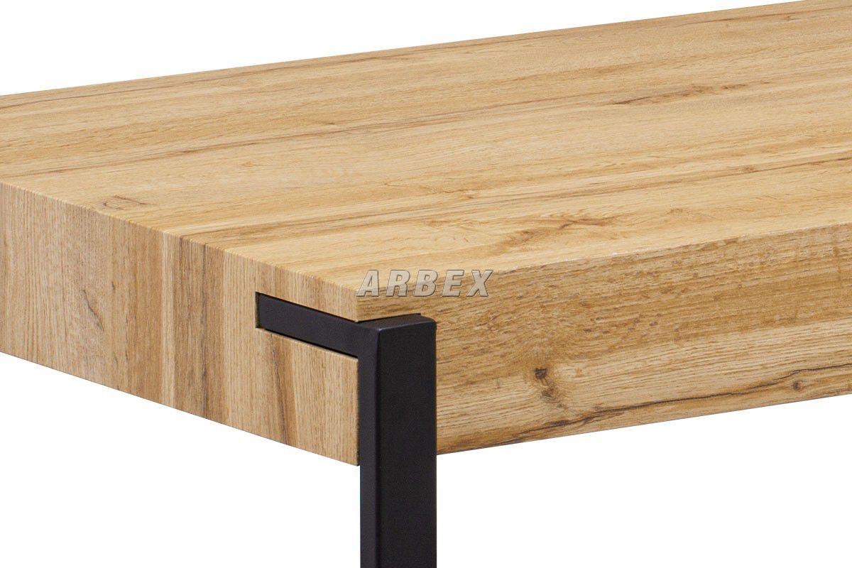 Konferenční stolek v industriálním stylu. Deska a lemy jsou MDF v dekoru divoký dub, o výšce 10 cm. Kovové nohy jsou obdélníkového průřezu 4 x 2 cm a v černém matném laku.