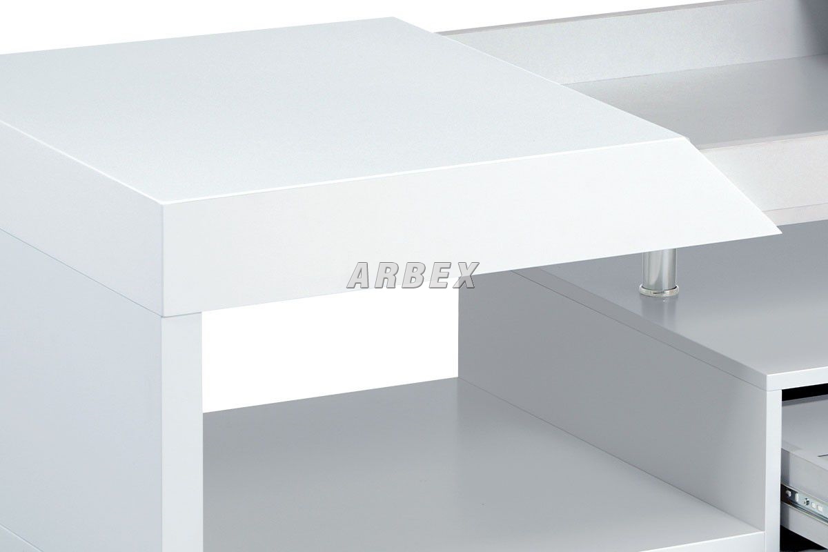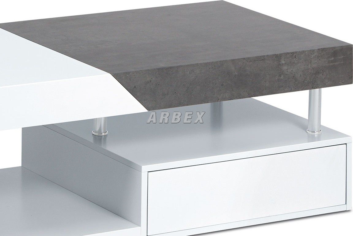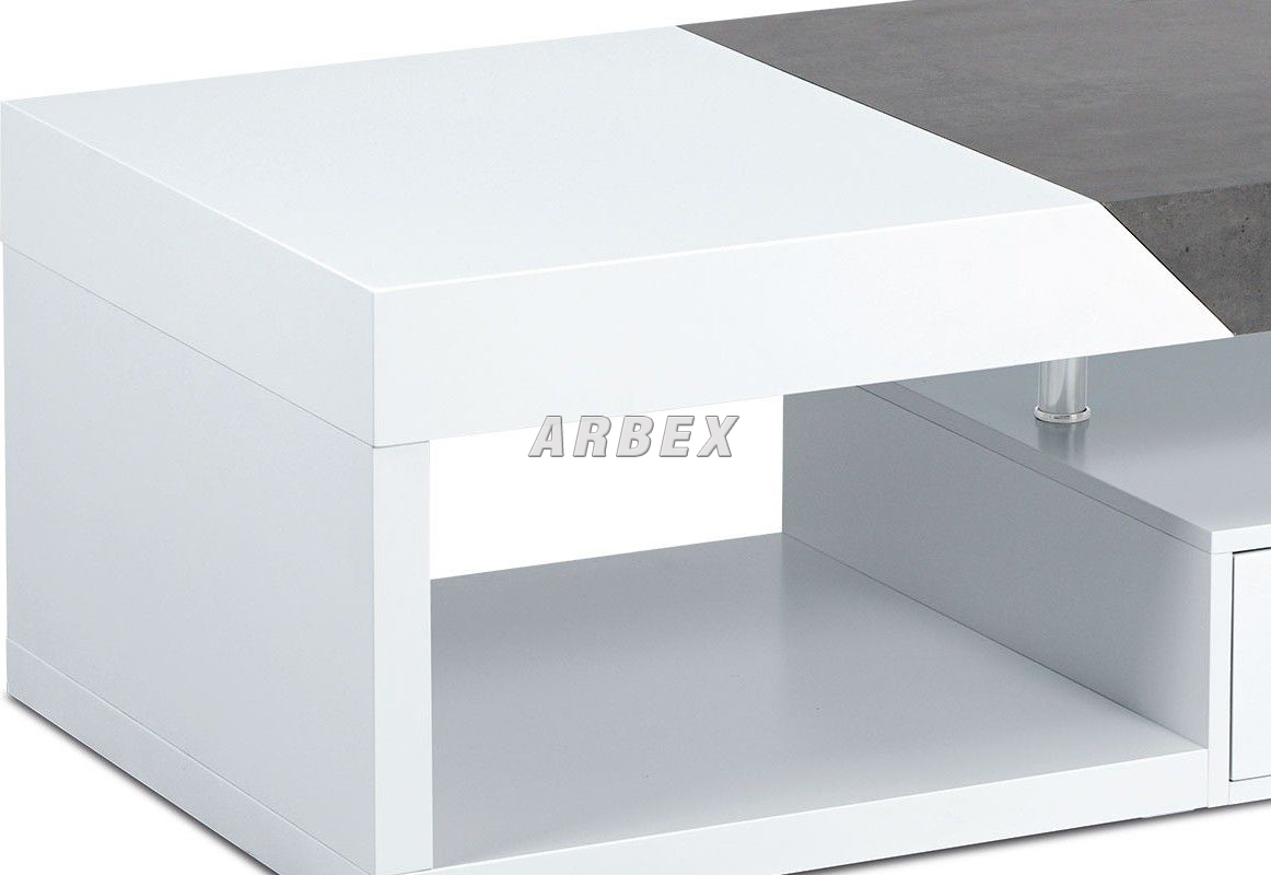 Moderní konferenční stolek v bílém matu, který je nejen velice pohledný, ale také opravdu praktický. Vrchní deska lze roztáhnout do šíře až 165 cm, díky čemuž se otevře úložný prostor pod deskou s vnitřním rozměrem 63x51x6,5 cm. Odsunout lze polovinu v dekoru betonu. Vrchní část je na třech kovových vzpěrách s chromovou úpravou. Stolek má také jeden výsuvný šuplík ve spodní části, který se stisknutím hladce otevře. Vnitřní rozměr šuplíku je 51x33x11 cm. Další úložný prostor je zajištěn pomocí dvou přihrádek pod vrchní deskou.
