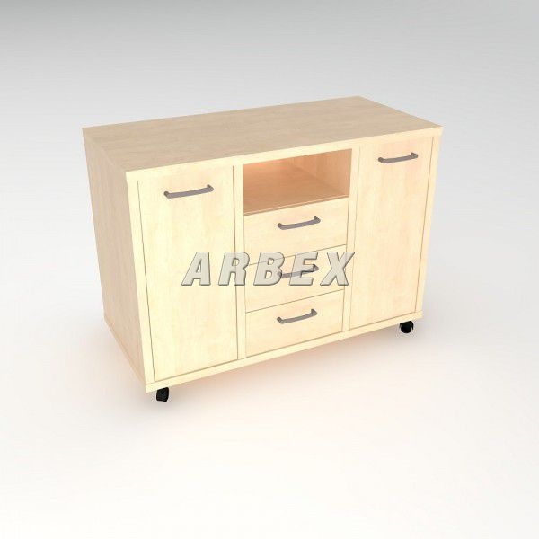 Pojízdný kontejner z laminované dřevotřísky, 3 zásuvky a 2 skříňky po stranách, vybaven kolečky, nosnost 20 kg, 3 typy dezénů