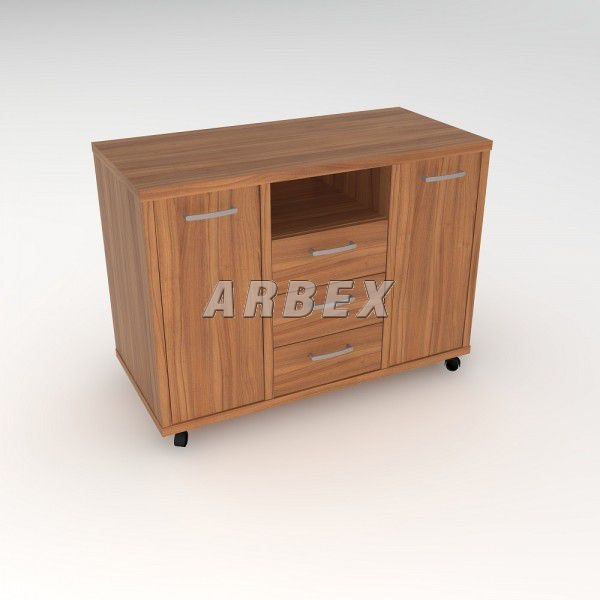 Pojízdný kontejner z laminované dřevotřísky, 3 zásuvky a 2 skříňky po stranách, vybaven kolečky, nosnost 20 kg, 3 typy dezénů