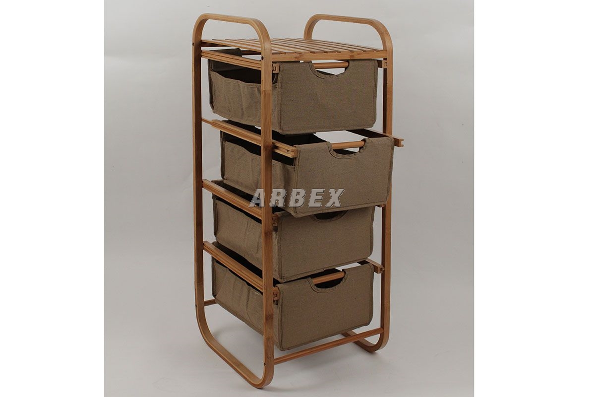 Stylový regál se čtyřmi látkovými šuplíky, hnědé barvy.