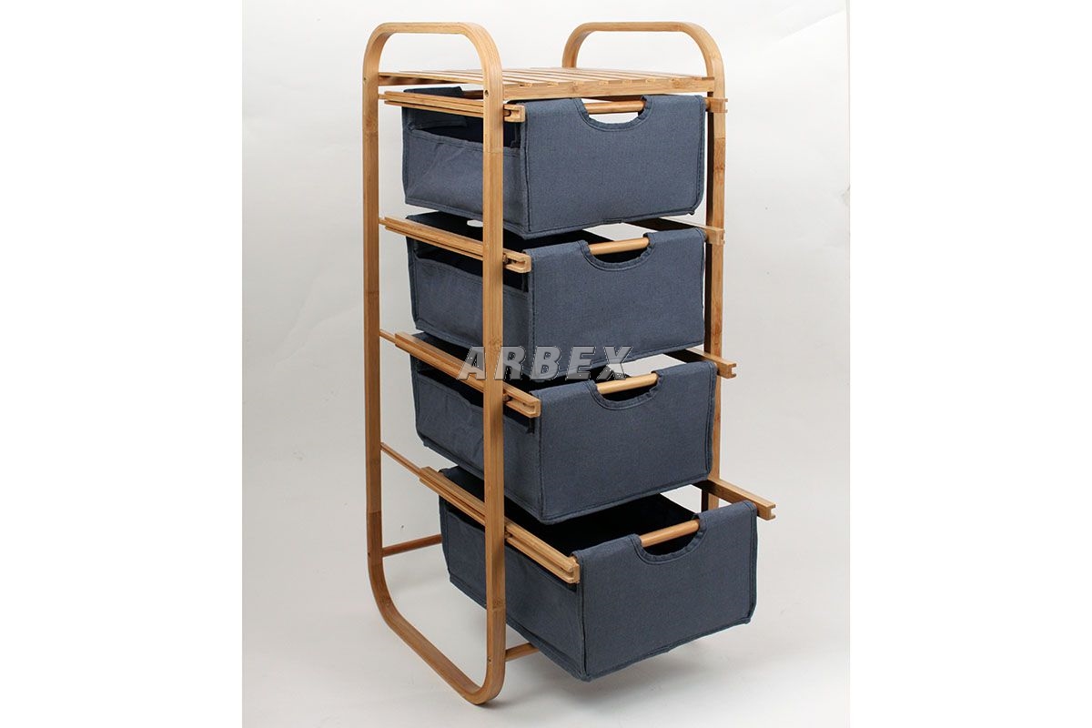 Stylový regál se čtyřmi látkovými šuplíky, modré barvy.