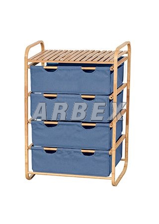 Regál v provedení bambus se 4-šuplíky v modré barvě.
