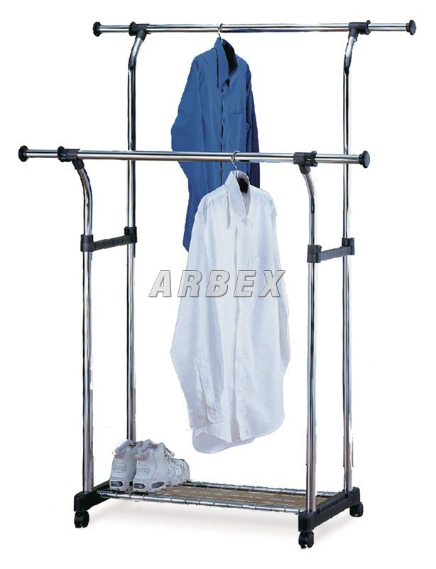 Stojan na šaty s dvěma výsuvnými rameny, ve spodní části s policí, v provedení chrom/černá.