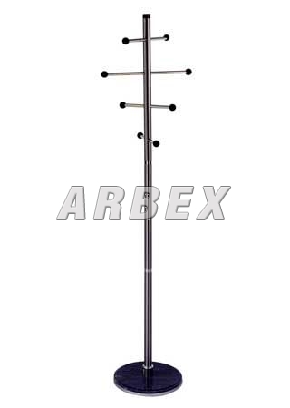 Stojanový kovový věšák, vhodný do předsíně nebo kanceláře. Výška 190 cm Barva chrom s černými doplňky. Těžká základna zajišťuje stabilitu věšáku