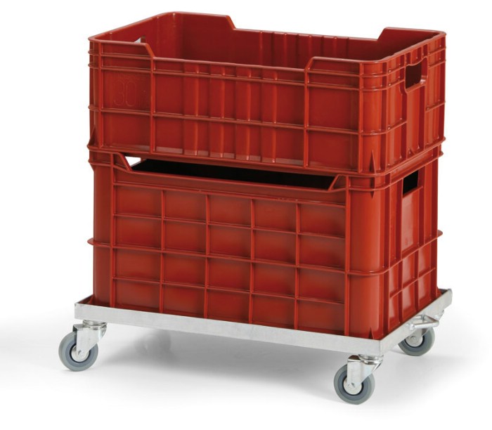Plošinka určena pro přepravky rozměrů 600 x 400 mm. Nosnost 150 kg. Povrchová úprava pozinkováním. 4 otočná kola s šedými běhouny, které nezanechávají stopy.