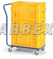 Plošinka určena pro plastové přepravky rozměrů 600 x 400 mm. Nosnost 150 kg. Madlo z ocelové trubky, povrchová úprava práškovaným lakem modré barvy RAL 5010. 4 otočná kola s pryžovými běhouny šedé barvy, které nezanechávají stopy, průměr kol 75 mm. Výška madla: 900 mm.