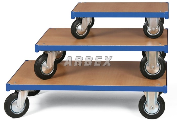 Multifunkční přepravní vozík. Ložná plocha je svařena z ocelových trubek a profilů, díky čemuž je zaručena stabilita. Kovové části jsou nakomaxitovány práškovým lakem RAL 5005. Ložná plocha je vyrobena z laminované dřevotřísky se vzorem světlý buk. Kola na vozíku jsou od předního světového francouzského výrobce firmy Guitel, díky čemuž je zaručeno min. opotřebení a nosnost i při těžkých provozních podmínkách. Kola jsou vybavena poklicí, která brání namotávání nití a provázků a také zanášení ložiska různými nečistotami, čímž se prodlužuje životnost kola. Kola jsou plná, čímž je zaručen velice tichý chod. 2 kola jsou pevná a 2 otočná podél vlastní osy. Tyto vozíky díky robustní konstrukci ložné plochy a kvalitním kolům vyhoví i náročným provozům, kde je potřeba manipulovat s nákladem vysoké hmotnosti. Díky kvalitním kolům a kvalitním kovovým částem je zaručena dlouhá životnost.