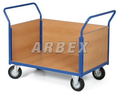 Multifunkční přepravní vozík. Ložná plocha je svařena z ocelových trubek a profilů, díky čemuž je zaručena stabilita. Kovové části jsou nakomaxitovány práškovým lakem RAL 5005. Ložná plocha a dřevěná výplň je vyrobena z laminované dřevotřísky se vzorem světlý buk. Kola na vozíku jsou od předního světového francouzského výrobce firmy Guitel, díky čemuž je zaručeno min. opotřebení a nosnost i při těžkých provozních podmínkách. Kola jsou vybavena poklicí, která brání namotávání nití a provázků a také zanášení ložiska různými nečistotami, čímž se prodlužuje životnost kola. Kola jsou plná, čímž je zaručen velice tichý chod. Kola jsou o průměru 200 mm. 2 kola jsou pevná a 2 otočná podél vlastní osy. Tyto vozíky díky robustní konstrukci ložné plochy a kvalitním kolům vyhoví i náročným provozům, kde je potřeba manipulovat s nákladem vysoké hmotnosti. Díky kvalitním kolům a kvalitním kovovým částem je zaručena dlouhá životnost.