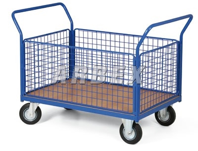 Multifunkční přepravní vozík. Ložná plocha je svařena z ocelových trubek a profilů, díky čemuž je zaručena stabilita. Kovové části jsou nakomaxitovány práškovým lakem RAL 5005. Ložná plocha je vyrobena z laminované dřevotřísky se vzorem světlý buk. Výplně z ocelového pletiva jsou z drátu o průměru 4 mm a s oky velikosti 50 x 50 mm. Kola na vozíku jsou od předního světového francouzského výrobce firmy Guitel, díky čemuž je zaručeno min. opotřebení a nosnost i při těžkých provozních podmínkách. Kola jsou vybavena poklicí, která brání namotávání nití a provázků a také zanášení ložiska různými nečistotami, čímž se prodlužuje životnost kola. Kola jsou plná, čímž je zaručen velice tichý chod. Kola jsou o průměru 200 mm. 2 kola jsou pevná a 2 otočná podél vlastní osy. Tyto vozíky díky robustní konstrukci ložné plochy a kvalitním kolům vyhoví i náročným provozům, kde je potřeba manipulovat s nákladem vysoké hmotnosti. Díky kvalitním kolům a kvalitním kovovým částem je zaručena dlouhá životnost.