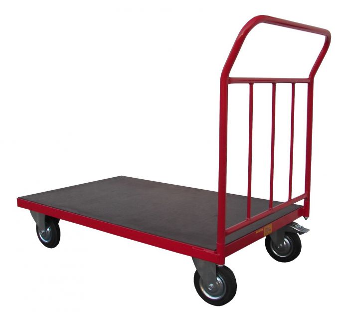 Plošinové vozíky s jedním madlem a se svislými příčkami, opatřené vodovzdornou deskou o tloušťce 18 mm s protiskluzovou úpravou.