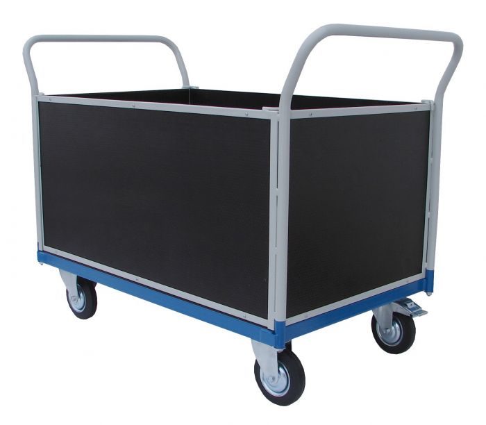 Plošinové vozíky se dvěma madly a bočnicemi s deskou, opatřené vodovzdornou deskou o tloušťce 18 mm s protiskluzovou úpravou.