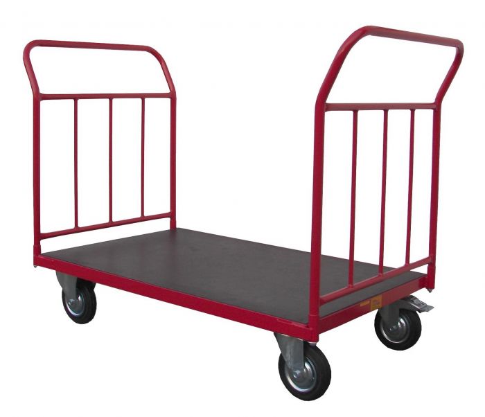 Plošinové vozíky se dvěma madly a se svislými příčkami, opatřené vodovzdornou deskou o tloušťce 18 mm s protiskluzovou úpravou.