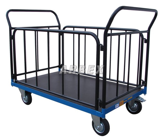 Plošinové vozíky se dvěma madly a se svislými příčkami a bočnicemi, opatřené vodovzdornou deskou o tloušťce 18 mm s protiskluzovou úpravou.