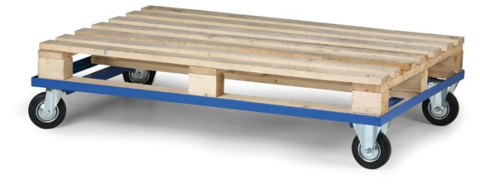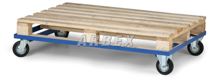 Vozík na EURO palety vhodný všude tam, kde potřebujete lehce maniuplovat s paletami. Konstrukce z L profilů o rozměrech uzpůsobených na EUR paletu 1200 x 800 mm. Povrchová úprava je provedena práškovým lakem v odstínu RAL 5005. Podvozek je opatřen dvěmi pevnými a dvěmi otočnými koly o průměru 125 mm pro snadnou manipulaci. Při manipulaci by měla být vždy otočná kola na straně manipulující osoby.