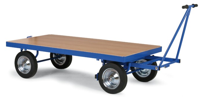 Tyto plošinové vozy jsou výbornými pomocníky ve skladech či výrobních halách, kde potřebujete převážet větší množství materiálů či výrobků o vyšší nosnosti. Nosnost vozíku je 600 kg(1500 kg) a velikost ložné plochy je 2000 x 1000 mm. Kola jsou dušová (plná) o průměru 400 mm s kovovým diskem diskem. Kovové části jsou nakomaxitovány práškovým lakem RAL 5005. 4 násuvná rohová pouzdra pro nástavby, zaručují velikou variabilitu využití těchto velkých vozů. Řízení vozíku je možné pomocí otočné desky s kuličkovým věncem. K dispozici je oj s madlem a taktéž pojezdová a zjišťovací brzda. Zvednutím táhla do horní poloviny dojde k zablokování kol. Standardním vybavením je taktéž zadní přípojné zařízení. Lze doobjednat tažné oko na oji. Plošina vozíku je z laminované dřevotřísky.