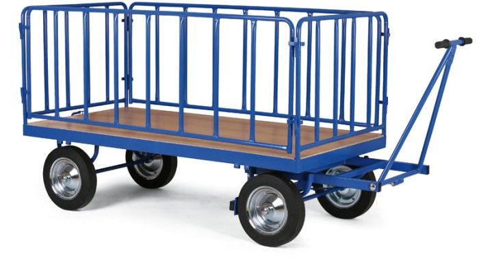 Tyto plošinové vozy jsou výbornými pomocníky ve skladech či výrobních halách, kde potřebujete převážet větší množství materiálů či výrobků o vyšší hmotnosti. Nosnost vozíku je 1500 kg a velikost ložné plochy je 2000 x 1000 mm. Kola jsou plná o průměru 400 mm s kovovým diskem diskem. Kovové části jsou nakomaxitovány práškovým lakem RAL 5005. Řízení vozíku je možní pomocí otočné desky s kuličkovým věncem. K dispozici je oj s madlem a taktéž pojezdová a zjišťovací brzda. Zvednutím táhla do horní poloviny dojde k zablokování kol. Výška kovové ohrádky je 770 mm. Standardním vybavením je taktéž zadní přípojné zařízení. Lze doobjednat tažné oko na oji. Plošina vozíku je z laminované dřevotřísky.