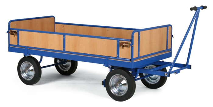 Tyto plošinové vozy jsou výbornými pomocníky ve skladech či výrobních halách, kde potřebujete převážet větší množství materiálů či výrobků o vyšší nosnosti. Nosnost vozíku je 600 kg (1500 kg) a velikost ložné ploch je 2000 x 1000 mm. Kola jsou dušová o průměru 400 mm s plastovým diskem. Kovové části jsou nakomaxitovány práškovým lakem RAL 5005.  Řízení vozíku je možní pomocí otočné desky s kuličkovým věncem. K dispozici je oj s madlem a taktéž pojezdová a zjišťovací brzda. Zvednutím táhla do horní poloviny dojde k zablokování kol. Výška ohrádky z dřevotřísky je 250 mm, výška čel 370 mm. 2 boční strany jsoi odklopné a nebo demontovatelné. Standardním vybavením je taktéž zadní přípojné zařízení. Lze doobjednat tažné oko na oji. Plošina vozíku je z laminované dřevotřísky.