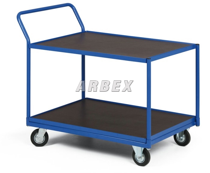 Dílenský policový vozík vhodný především na přepravu různého druhu zboží či drobnějšího materiálu do skladů, výrobních hal a provozoven. Konstrukce vozíku je svařena z ocelových profilů. Nosnost vozíku je 200 (300, 400) kg. Povrchová úprava je provedena práškovým vypalovacím lakem odstínu RAL 5005 - modrá. Police je z vysokoodolné vodovzdorné překližky - má vysokou nosnost a odolnost proti povrchovému poškození.Rozměr police je 1000 x 700 mm. Kola na vozíku jsou od předního světového francouzského výrobce firmy Guitel, díky čemuž je zaručeno min. opotřebení a nosnost i při těžkých provozních podmínkách. Kola jsou vybavena poklicí, která brání namotávání nití a provázků a také zanášení ložiska různými nečistotami, čímž se prodlužuje životnost kola. Kola jsou plná, čímž je zaručen velice tichý chod. Kola jsou o průměru 125 mm a 2 jsou pevná a 2 otočná podle vlastní osy.
