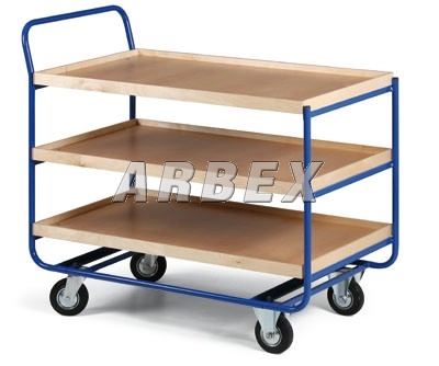 Dílenské policové vozíky jsou vhodným řešením pro téměř jakékoliv použití. Výhodou jsou zvýšené okraje polic zabraňující sesunutí vezených předmětů z police na zem. Kola jsou z černé pryže o průměru 125 mm, disky kol jsou vybaveny poklicí zabraňující namotávání nečistost. Konstrukce je ocelových trubek a profilů. Ložná plocha je vyrobena z laminované dřevotřísky se vzorem světlý buk. Kovové části jsou lakovány práškovým lakem v odstínu 5005 barevné stupnice RAL.
