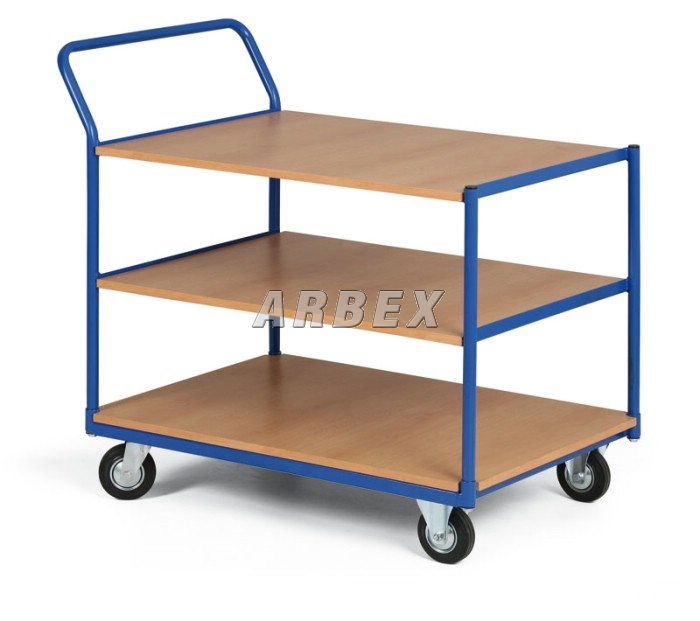 Dílenský policový vozík vhodný především na přepravu různého druhu zboží či drobnějšího materiálu do skladů, výrobních hal a provozoven. Konstrukce vozíku je svařena z ocelových profilů. Nosnost vozíku je 200 (300, 400) kg. Povrchová úprava je provedena práškovým vypalovacím lakem odstínu RAL 5005 - modrá. Police jsou z laminované dřevotřísky. Kola jsou vybavena poklicí, která brání namotávání nití a provázků a také zanášení ložiska různými nečistotami, čímž se prodlužuje životnost kola. Kola jsou plná, čímž je zaručen velice tichý chod. Kola jsou o průměru 125 (160, 200) mm a 2 jsou pevná a 2 otočná podle vlastní osy.