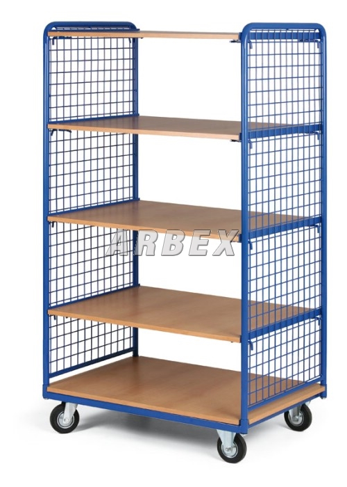 Dílenský policový vozík vhodný především na přepravu různého druhu zboží či drobnějšího materiálu do skladů, výrobních hal a provozoven. Konstrukce vozíku je svařena z ocelových profilů. Nosnost vozíku je 200 (300, 400) kg. Povrchová úprava je provedena práškovým vypalovacím lakem odstínu RAL 5005 - modrá. Police jsou z laminované dřevotřísky . Kola jsou vybavena poklicí, která brání namotávání nití a provázků a také zanášení ložiska různými nečistotami, čímž se prodlužuje životnost kola. Kola jsou plná, čímž je zaručen velice tichý chod. Kola jsou o průměru 125 (160, 200) mm a 2 jsou pevná a 2 otočná podél vlastní osy.
