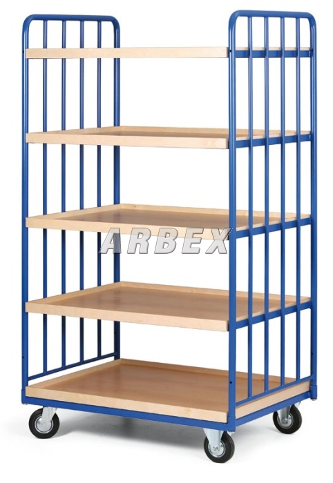 Dílenský policový vozík vhodný především na přepravu různého druhu zboží či drobnějšího materiálu do skladů, výrobních hal a provozoven. Konstrukce vozíku je svařena z ocelových profilů. Nosnost vozíku je 200 (300, 400) kg. Povrchová úprava je provedena práškovým vypalovacím lakem odstínu RAL 5005 - modrá. Police je z laminované dřevotřísky ohraněné překližkovou hranou zabraňující spadnutí převáženého materiálu mimo ložnou plochu. Výplň madel je z profilů o průměru 16 mm. Kola jsou vybavena poklicí, která brání namotávání nití a provázků a také zanášení ložiska různými nečistotami, čímž se prodlužuje životnost kola. Kola jsou plná, čímž je zaručen velice tichý chod. Kola jsou o průměru 125 (160, 200) mm a 2 jsou pevná a 2 otočná podél vlastní osy.