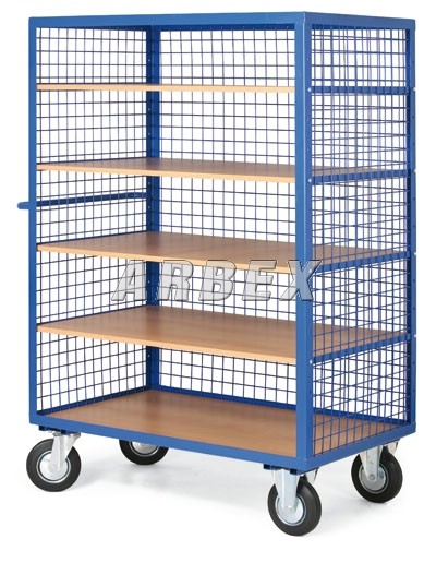 Tento vysoký robustní policový vozík s vysokou nosností je vhodný pro přepravu težšího materiálu či vybavení, zároveň díky velkému průměru kol 200 mm se s tímto vozíkem velice snadno manipuluje. Velikost plošiny je 1200 x 800 mm a celková výška 1750 mm. Nosnost vozíku je 600 kg. Pevná svařovaná konstrukce zajišťuje stabilitu. Pro snadnější manipulaci při překládání je čelní stěna sklopná. Kostra vozíku je celosvařovaná z ocelových profilů dokonalou svařovací technologií pod ochrannou atmosférou. Stěny a horní víko je ze síta 50 x50 x4 mm. Kola na vozíku jsou od předního světového francouzského výrobce firmy Guitel, díky čemuž je zaručeno min. opotřebení a nosnost i při těžkých provozních podmínkách. Kola jsou vybavena poklicí, která brání namotávání nití a provázků a také zanášení ložiska různými nečistotami, čímž se prodlužuje životnost kola. Kola jsou plná, čímž je zaručen velice tichý chod. Kola jsou o průměru 200 mm a 2 jsou pevná a 2 otočná podle vlastní osy. Kola lze doplnit na vyžádání dvojčinnou brzdou proti pojezdu i proti otáčení kolem svislé osy. Kovové části jsou nakomaxitovány práškovým lakem RAL 5005. Dno je z laminované dřevotřísky, která je vsazena do ocelového rámu.