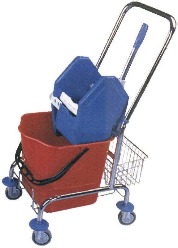 Chromovaná konstrukce na kolečkách. Vědro o objemu 20 litrů. Ždímač na všechny druhy mopů. Drátěný košík na čistící prostředky