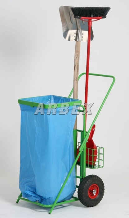Úklidový vozík, na plných kolech o průměru 260 mm. Možnost použití pytle 120 l, rámek 340 x 340 mm, 4 odkladácí trubice na pracovní náčiní - lopata, smeták apod., 1 odkládací přihrádka na náhradní pytle či menší nářadí. Dodává se bez vybavení.