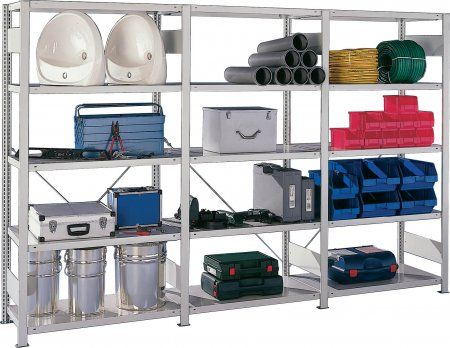 stabilní regály montované zásuvným systémem bez použití šroubových spojů nachází uplatnění zejména ve skladech, dílnách, archivech