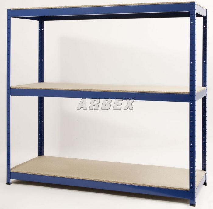 Kovový bezšroubový regál s 12 mm dřevotřískovou policí. Vhodný pro sklady, garáže dílny ap. Regál je nutno kotvit v horní části ve dvou místech do pevné stěny.