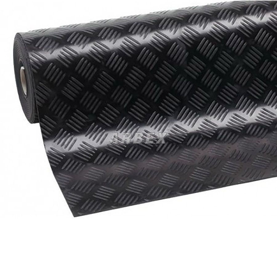 Černá průmyslová protiskluzová podlahová guma s dezénem "checker" má vynikající protiskluzové, protihlukové a tlumící vlastnosti. Je velice nenáročná na údržbu, velice snadno a rychle se pokládá a čistí.