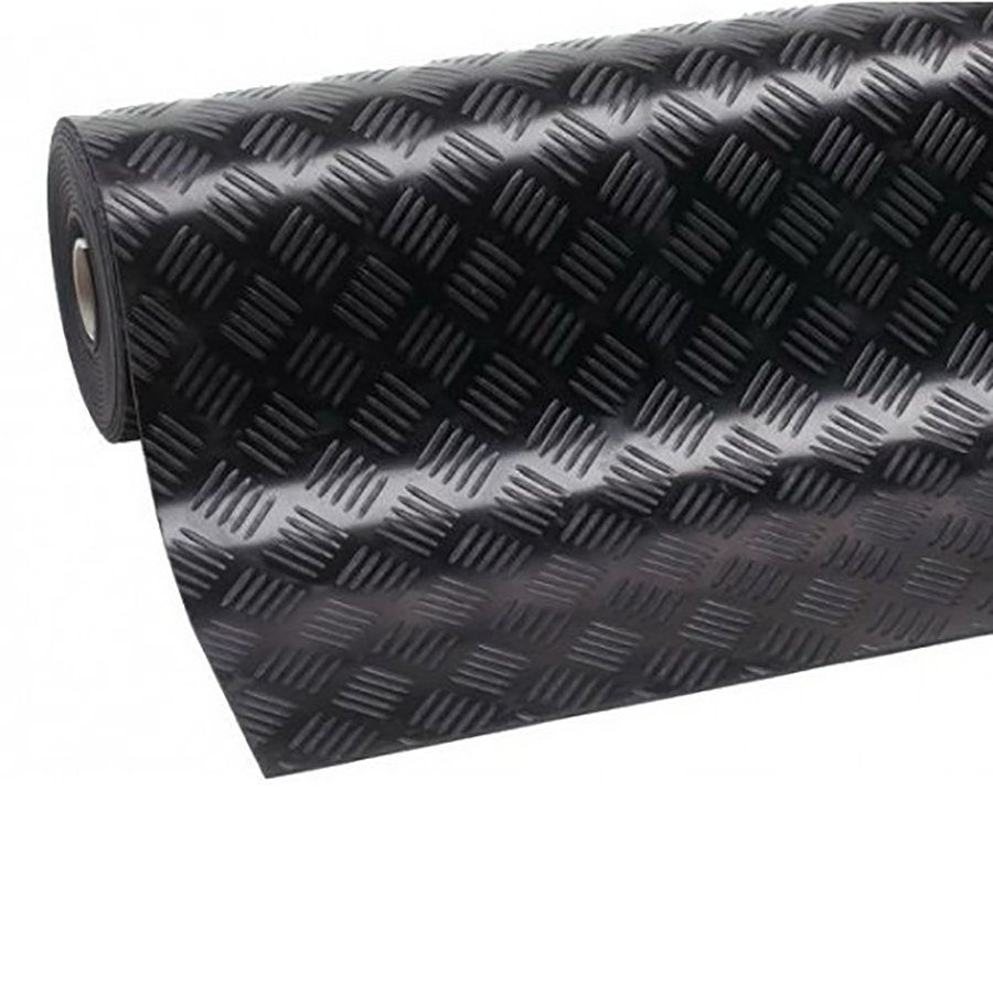 Černá průmyslová protiskluzová podlahová guma s dezénem checker má vynikající protiskluzové, protihlukové a tlumící vlastnosti. Je velice nenáročná na údržbu, velice snadno a rychle se pokládá a čistí.