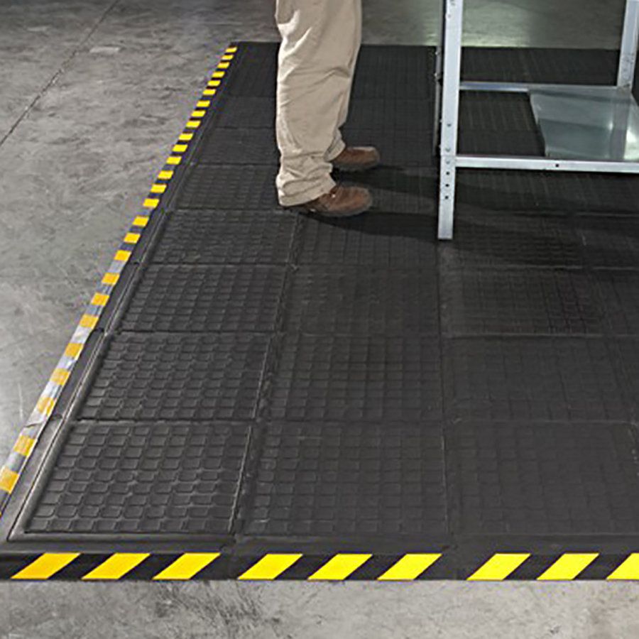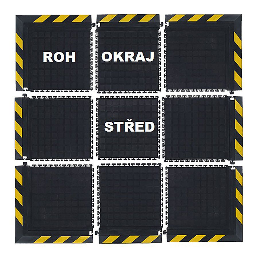 Podlahové dlaždice dodáváme v černé barvě s možností volby barvy okrajového pásku. V nabídce je okrajový pás v barvě černé, nebo černo-žluté.