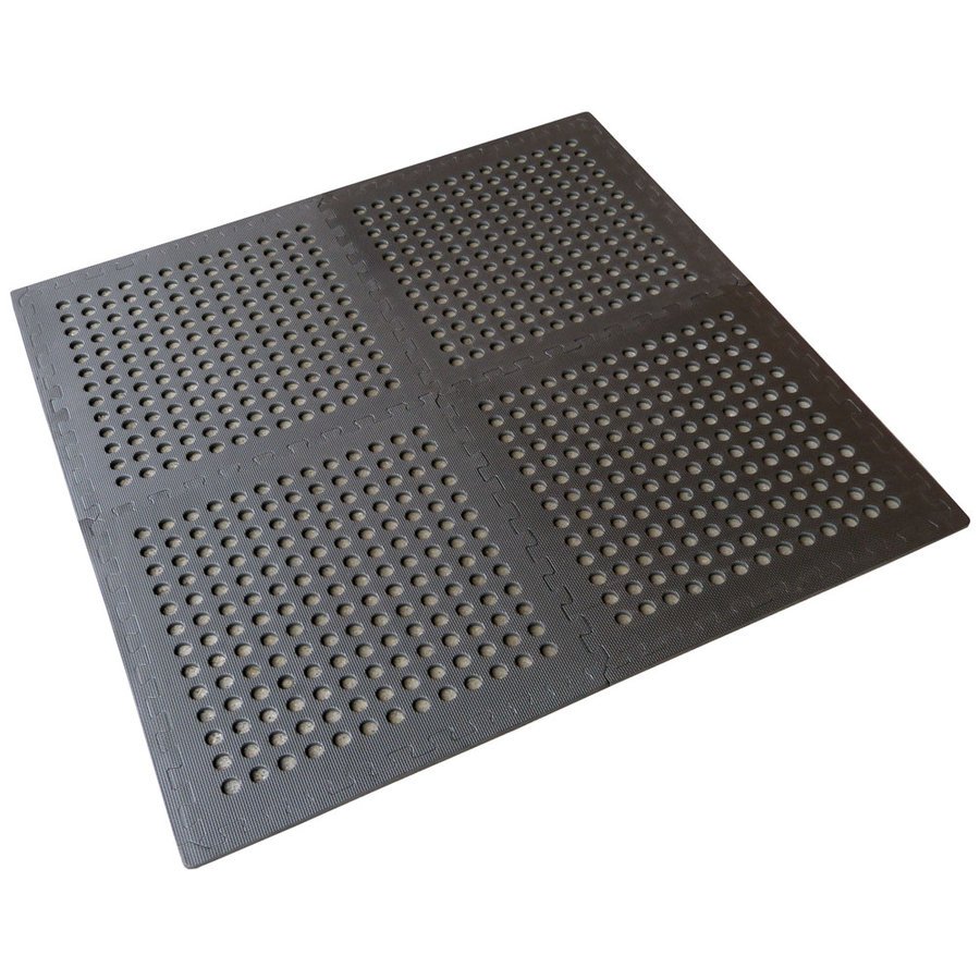 Černá modulární pěnová podlahová děrovaná podložka je ideální pro vlhké prostory a vysoké pěší zatížení. Otvory umožňuji odvod vody a propadávaní nečistot jako je písek a kamínky, díky tomu povrch zůstává stále čistý a suchý.
