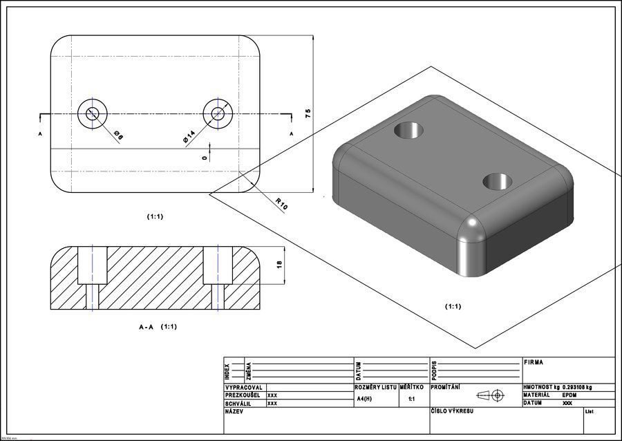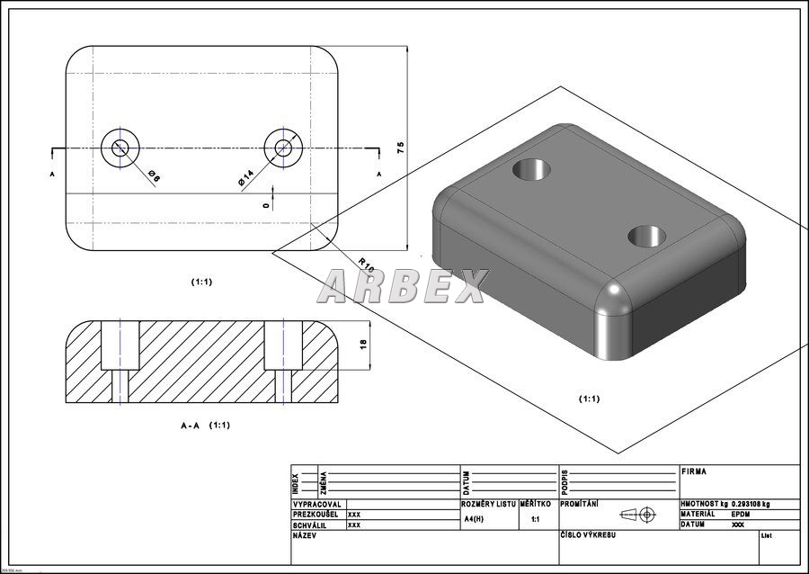 Obdélníkové gumové dorazy jsou vyráběny z pryže EPDM o tvrdosti 60°ShA. Pryž EPDM se vyznačuje vysokou odolností vůči stárnutí, povětrnostním vlivům, horké vodě, brzdovým a chladícím kapalinám, louhům a kyselinám. Guma EPDM má rozsah pracovních teplot od -50 do 150 °C.