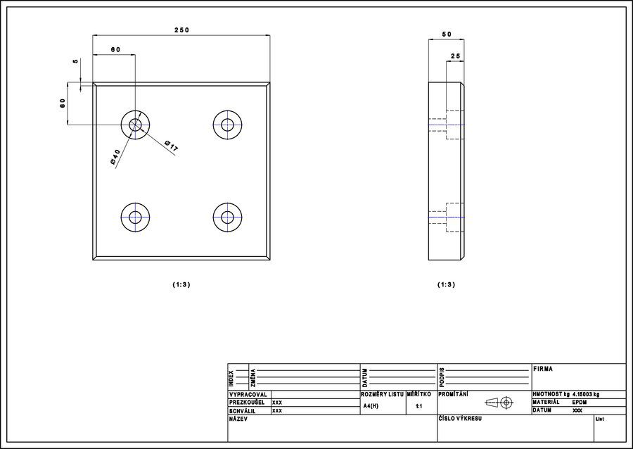 Obdélníkové gumové dorazy jsou vyráběny z pryže EPDM o tvrdosti 60°ShA. Pryž EPDM se vyznačuje vysokou odolností vůči stárnutí, povětrnostním vlivům, horké vodě, brzdovým a chladícím kapalinám, louhům a kyselinám. Guma EPDM má rozsah pracovních teplot od -50 do 150 °C.