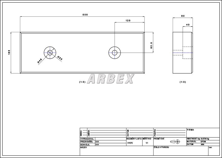 Obdélníkové gumové dorazy jsou vyráběny z pryže EPDM o tvrdosti 60°ShA. Pryž EPDM se vyznačuje vysokou odolností vůči stárnutí, povětrnostním vlivům, horké vodě, brzdovým a chladícím kapalinám, louhům a kyselinám. Guma EPDM má rozsah pracovních teplot od -50 do 150 °C.