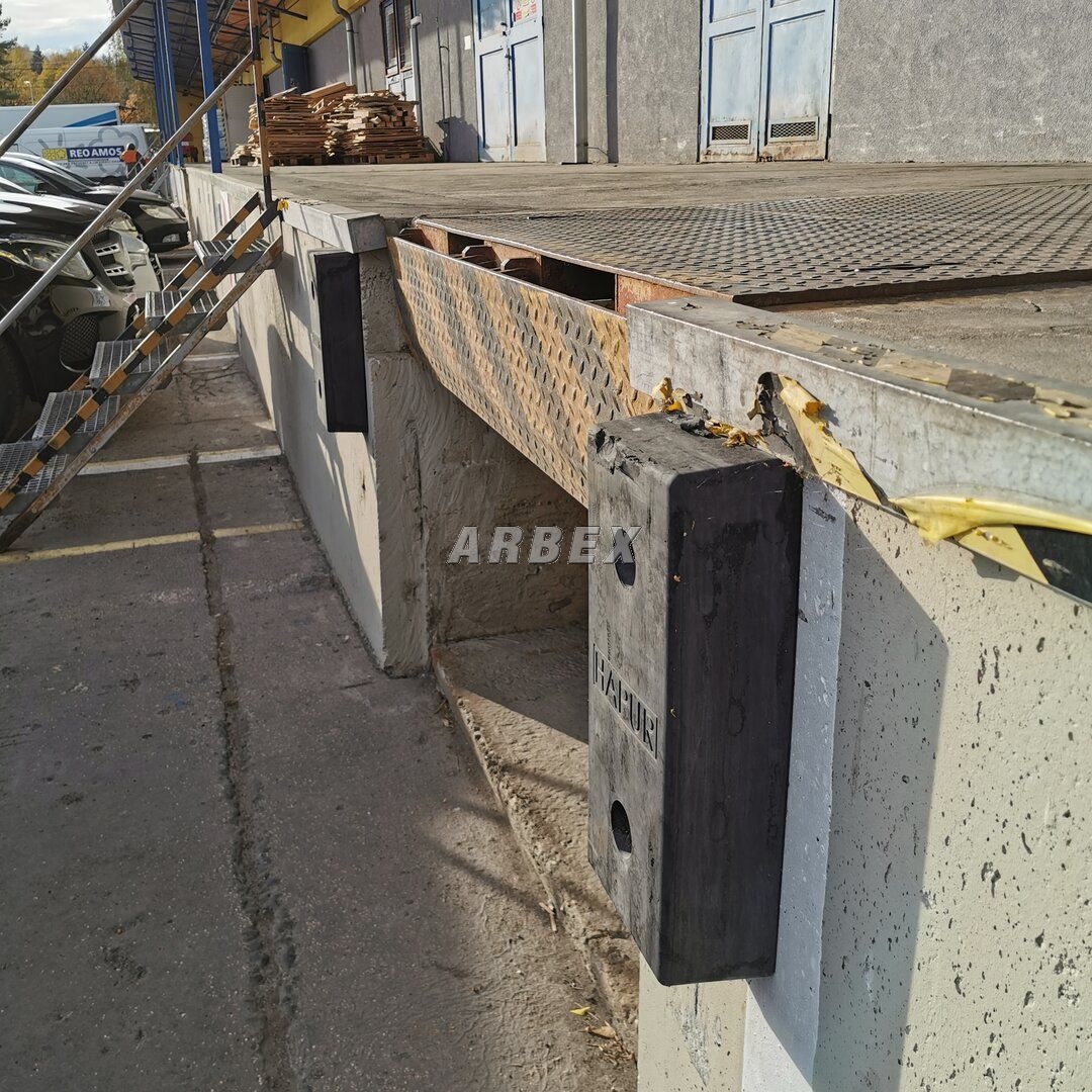 Gumové dorazy pro nakládací rampu slouží pro tlumení nárazu nákladních automobilů, vysokozdvižných vozíků a přívěsů k překládací rampě při couvání. Díky instalaci gumových nárazníků zabráníte poškození opláštění a samotného překládacího zařízení, např. vyrovnávacího můstku.