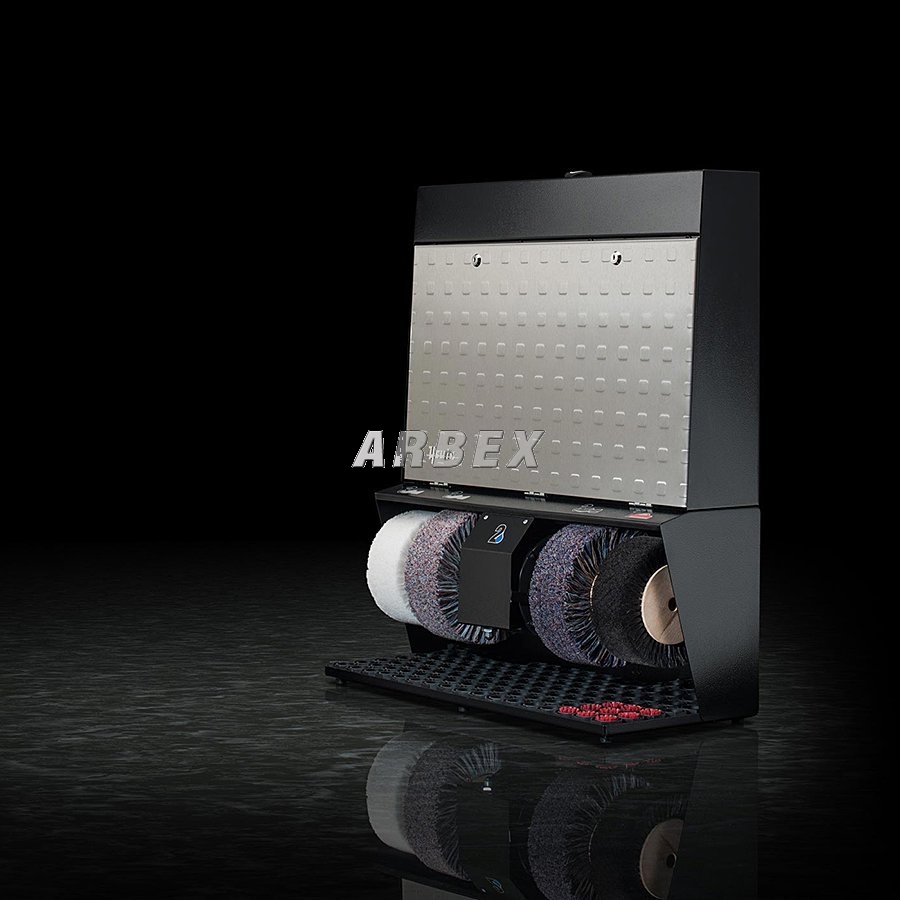 Černo-stříbrný (tlačená ocel) čistič obuvi Polifix 4 je určen především pro hotely, penziony a obchodní centra. Jedná se o velmi výkonný čistič se čtyřmi kartáči a nádržkou na polituru. Čistič na boty Polifix 4 je vybaven ručním senzorem s časovačem umístněným na vrchní části čističe.